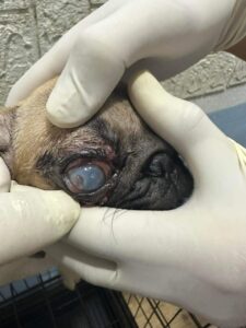 Bé CÚN Tên là BAM dòng PUG DOG , là vật nuôi của anh R… Hoàng, theo như anh chia sẻ thì bé đã từng bị bệnh Parvo Virus và được chữa lành từ bạn bán cún, Anh R… chia sẻ thêm thấy bé còi cọc tội và đáng thương nên anh mua lại bé và chăm sóc, biết đề kháng yếu và đôi mắt đã đục nhẹ, và hỏi bạn bán cún và được hướng dẫn nhỏ mắt bằng thuốc Tây. Anh R đã nhỏ và không thấy tiến triển và càng nặng hơn. Anh R… được biết đến MB Vet qua một vài người bạn và mang đến Bệnh Viện Thú Y MB Vet, và tâm sự quá trình của Bé cho Bác Sĩ Thú Y nhờ Bác sĩ can thiệp.
